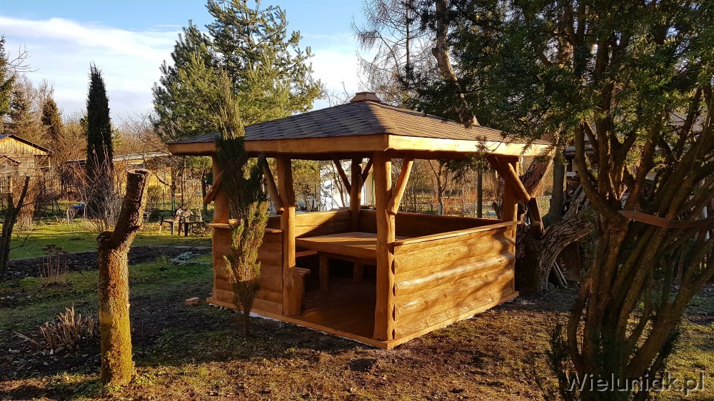 Altany ogrodowe wykonywane są z drewna sosnowego. Każda altana drewniana jest ustawiana na odpowiednio rozmieszczonych i wypoziomowanych podkładach betonowych, które zabezpieczają przed gromadzeniem się wody pod podłogą altany i zapewniają cyrkulację powietrza pod podłogą. Stosujemy również agrowłókninę, której zadaniem jest zapobieganie przerastaniu roślinności między deskami podłogowymi. Słupy altany mają wysokość 200 cm, natomiast całkowita wysokość altany wynosi 270 cm. Dachy altan wykonane są z desek boazeryjnych oraz pokryte gontem bitumicznym co zapewnia długoletnią trwałość każdej altany oraz odpowiednie wrażenia estetyczne. Każda z altan wyposażona jest w zestaw mebli, na który składają się stół z prostokątnym blatem oraz 4 ławki, zamocowanych do altany. Wszystkie elementy altany są odpowiednio strugane oraz dwukrotnie impregnowane. Na życzenie klienta możemy zamontować w altanie oświetlenie oraz dodatkowe kratownice. Wszystkie altany montujemy samodzielnie. Dostarczamy nasze produkty na terenie Polski oraz za granicę. Koszty transportu uzgadniamy indywidualnie z każdym klientem.