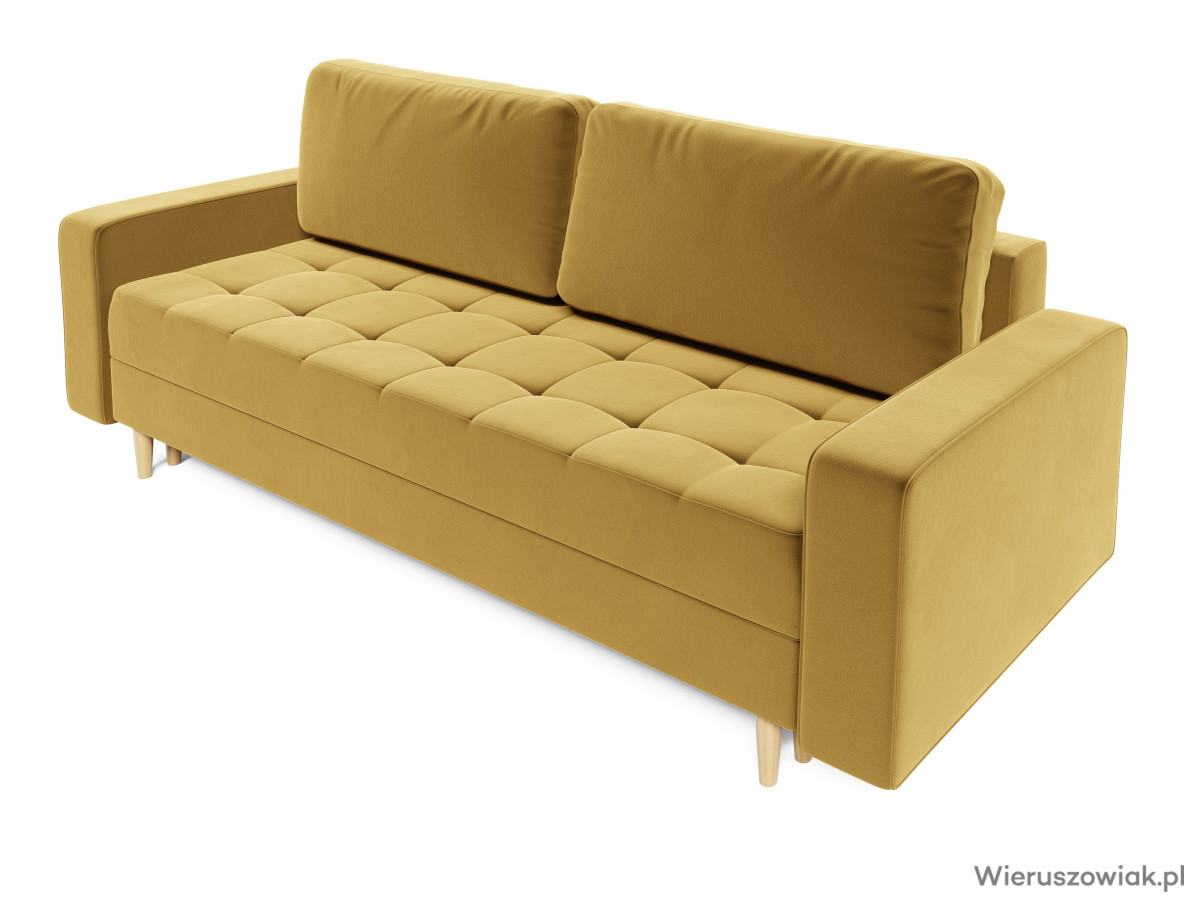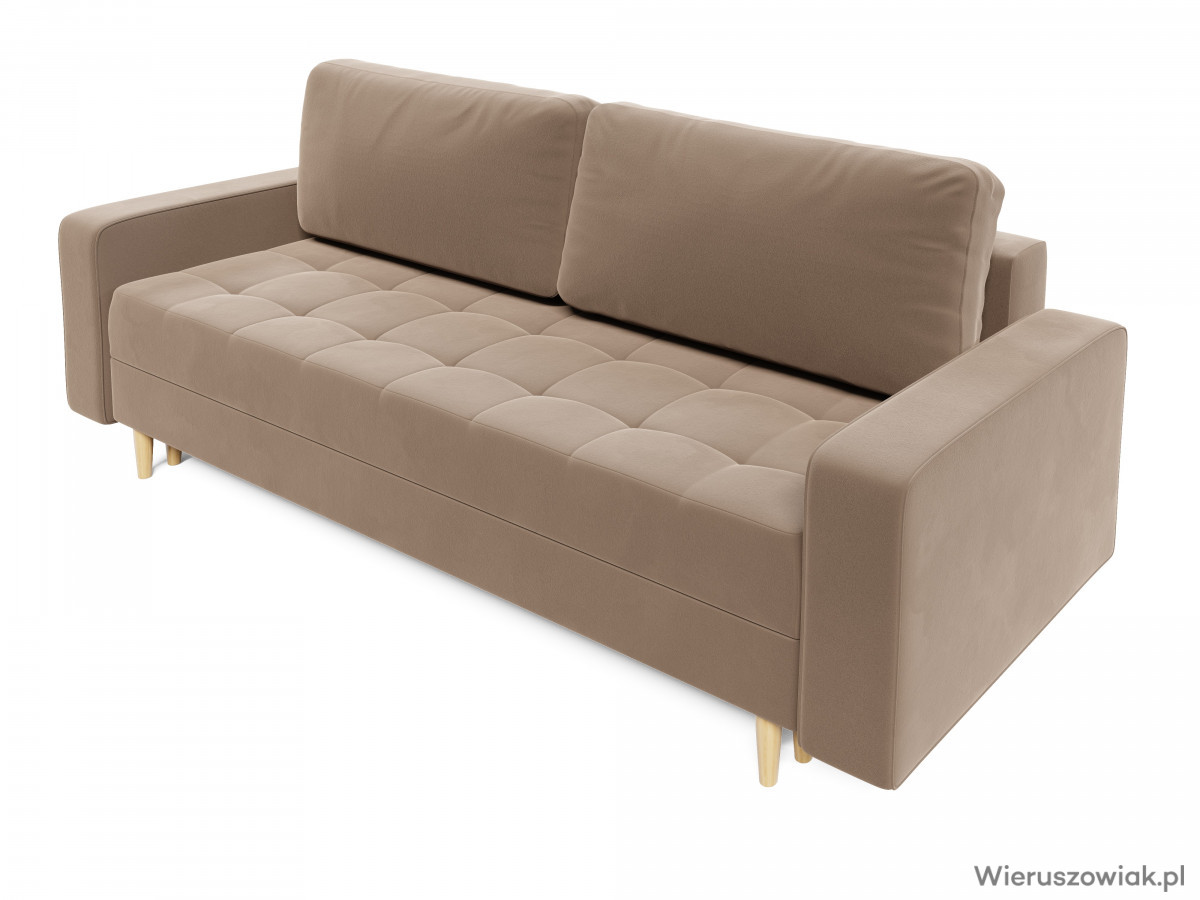 Sofa opiera się na solidnych, drewnianych stożkowych nóżkach, które nie tylko dodają jej nowoczesnego charakteru, ale także zapewniają stabilność. Tkaniny użyte do jej produkcji łączą estetykę z łatwością w pielęgnacji, gwarantując trwałość oraz komfort użytkowania.