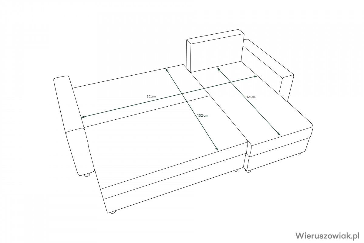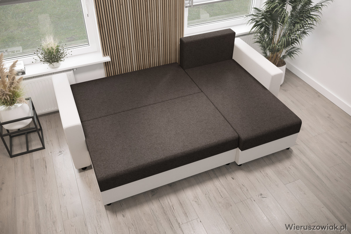 Dzięki funkcji spania, narożnik świetnie sprawdzi się jako dodatkowe miejsce noclegowe dla gości. Wbudowany pojemnik na pościel umożliwia praktyczne przechowywanie, pomagając utrzymać porządek w pomieszczeniu.