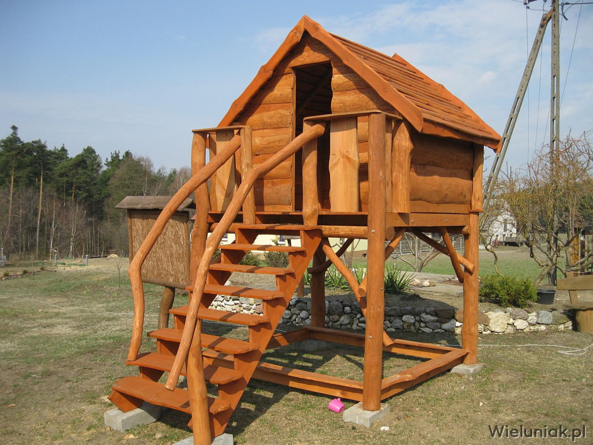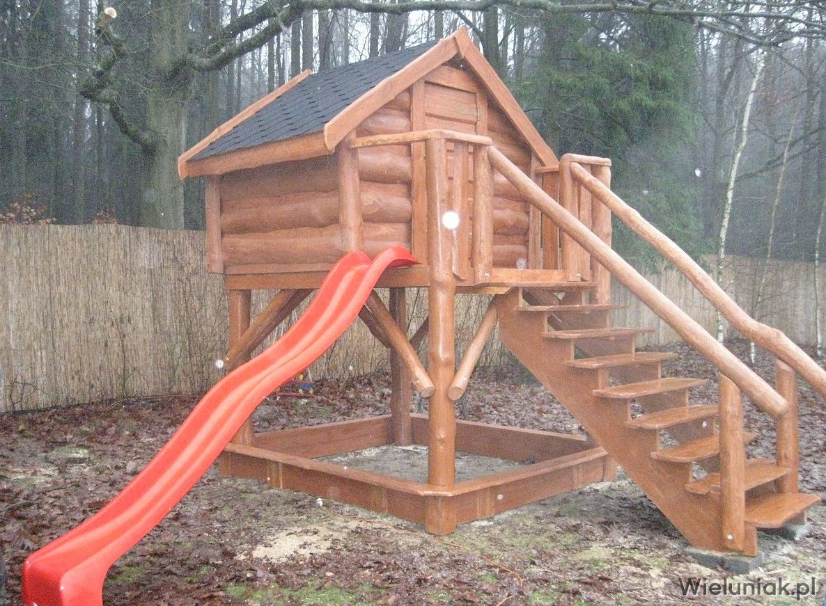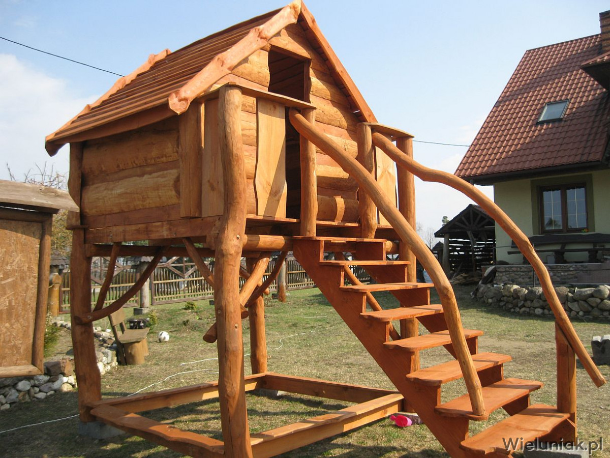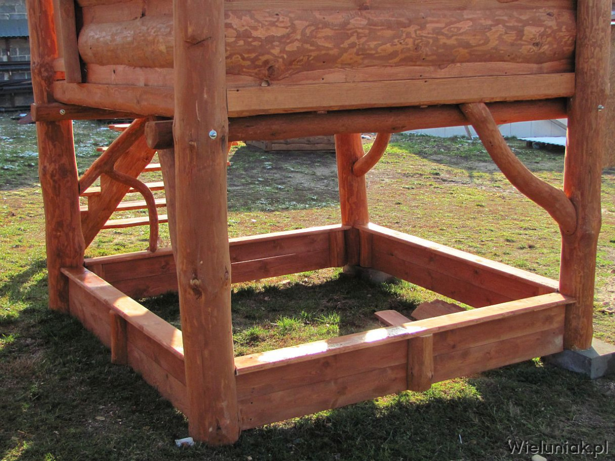 1) Elementy domku wykonane z pni drzew suchych, korowanych, szlifowanych.