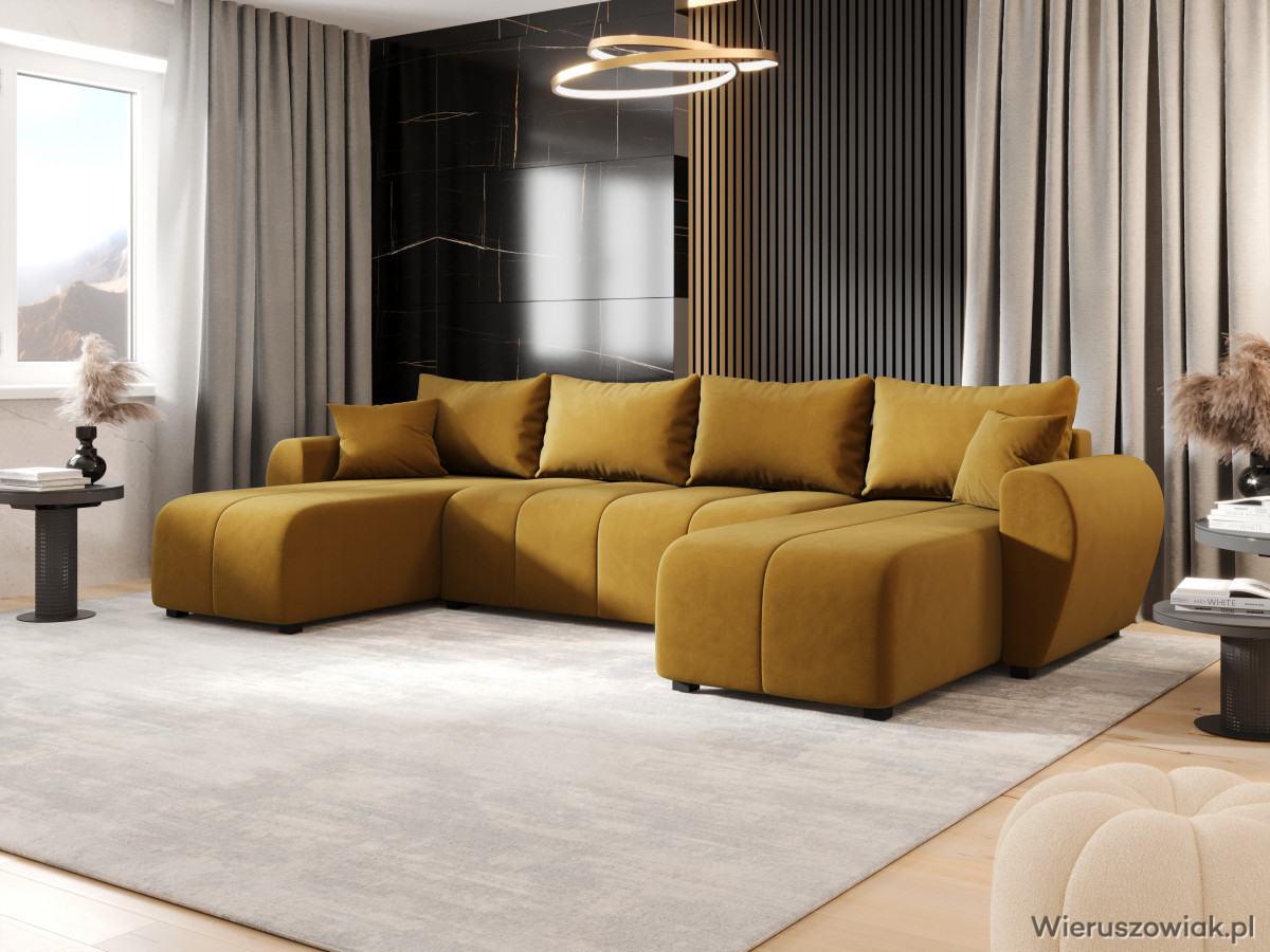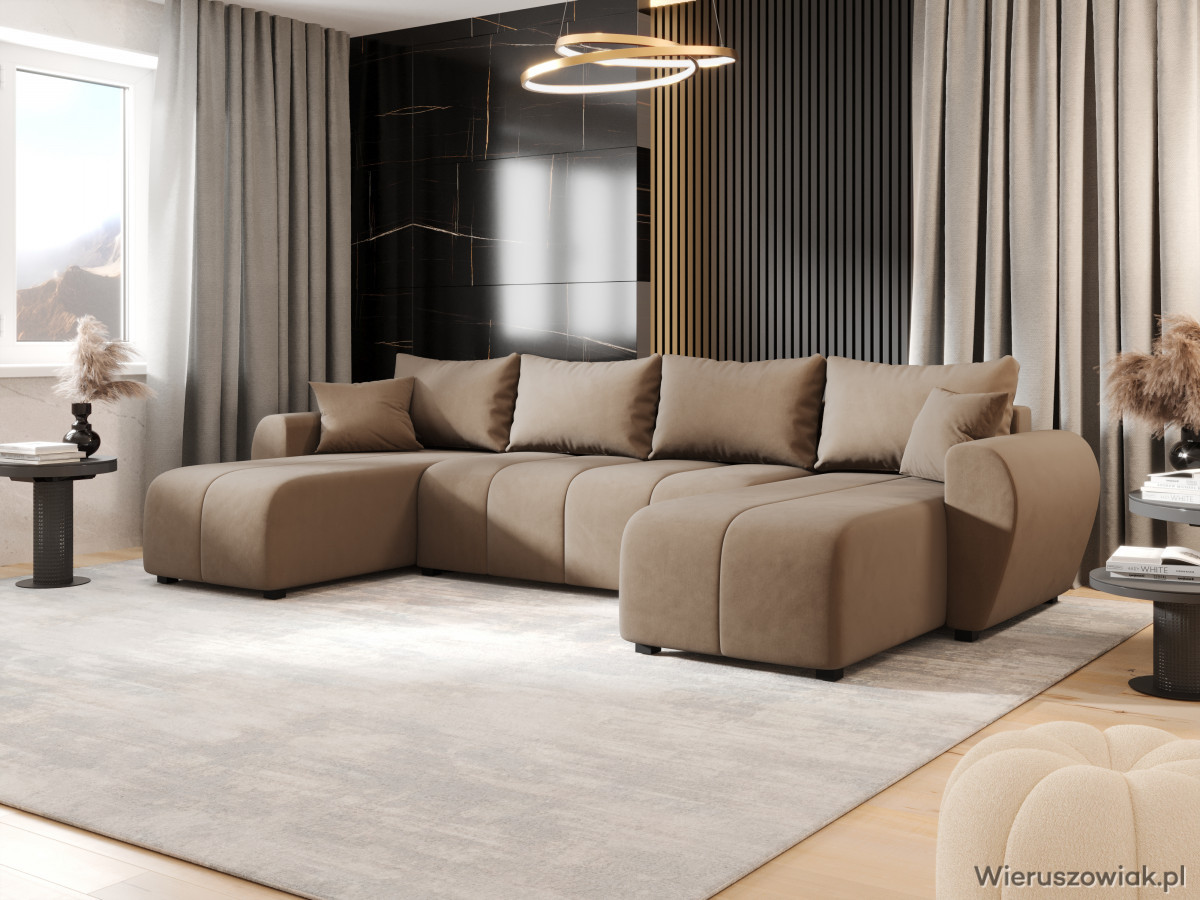 Nowoczesny narożnik MOLISA w kształcie litery U to propozycja dla osób ceniących przestronność, wygodę i elegancki design. Jego zaokrąglone linie i minimalistyczna forma doskonale wpisują się zarówno w nowoczesne, jak i klasyczne wnętrza.