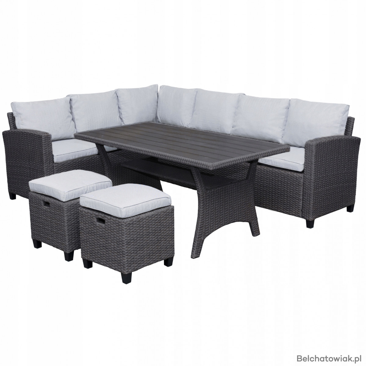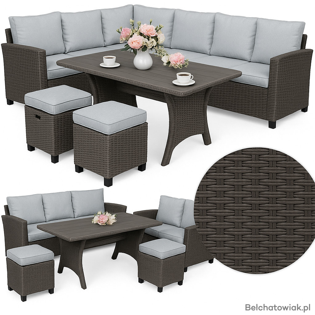 Zestaw wyposażony jest w grube, wygodne poduszki, a dwie praktyczne pufy uzupełniają całość, zapewniając komfort wypoczynku i dodatkowe miejsca do siedzenia.