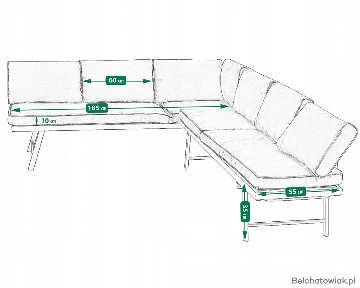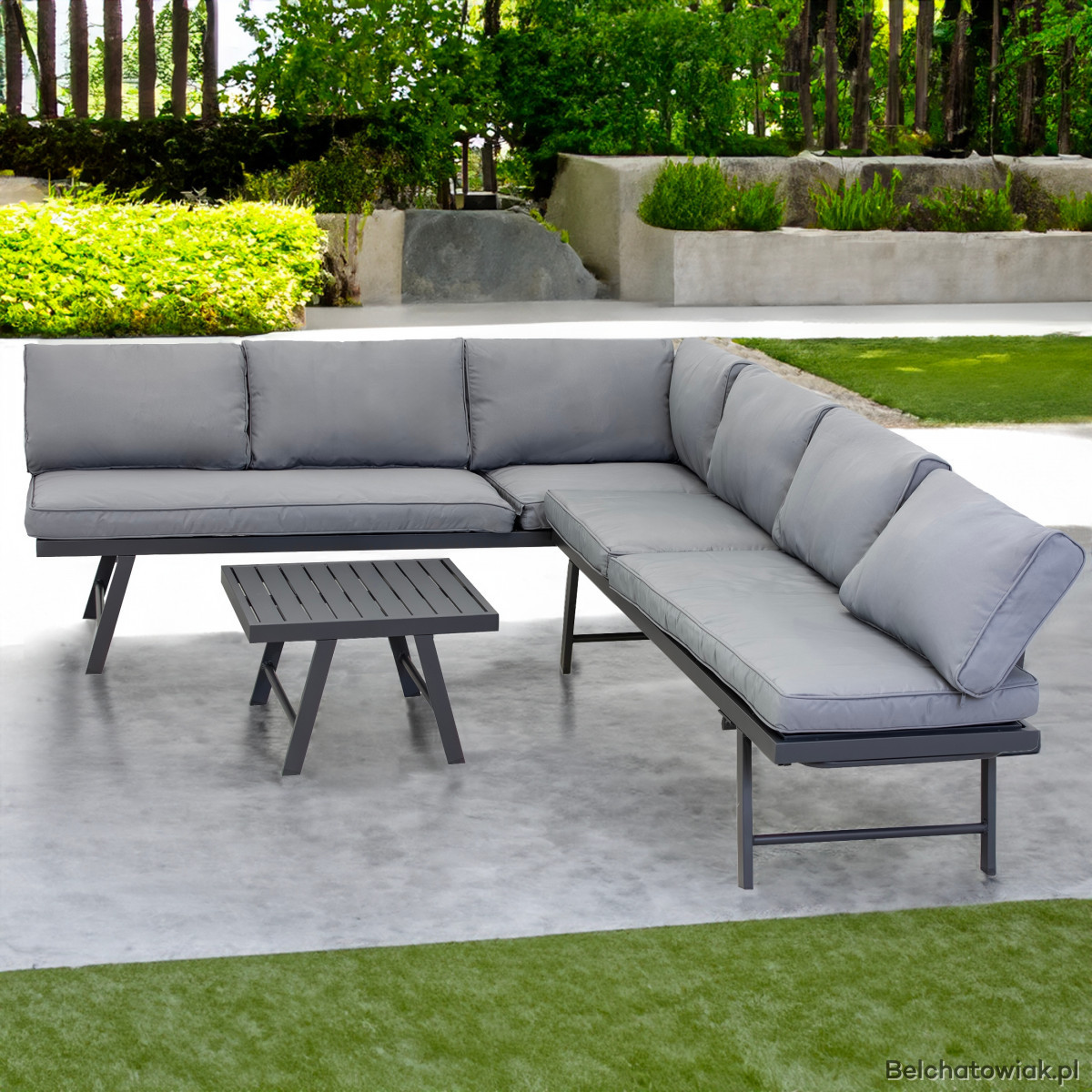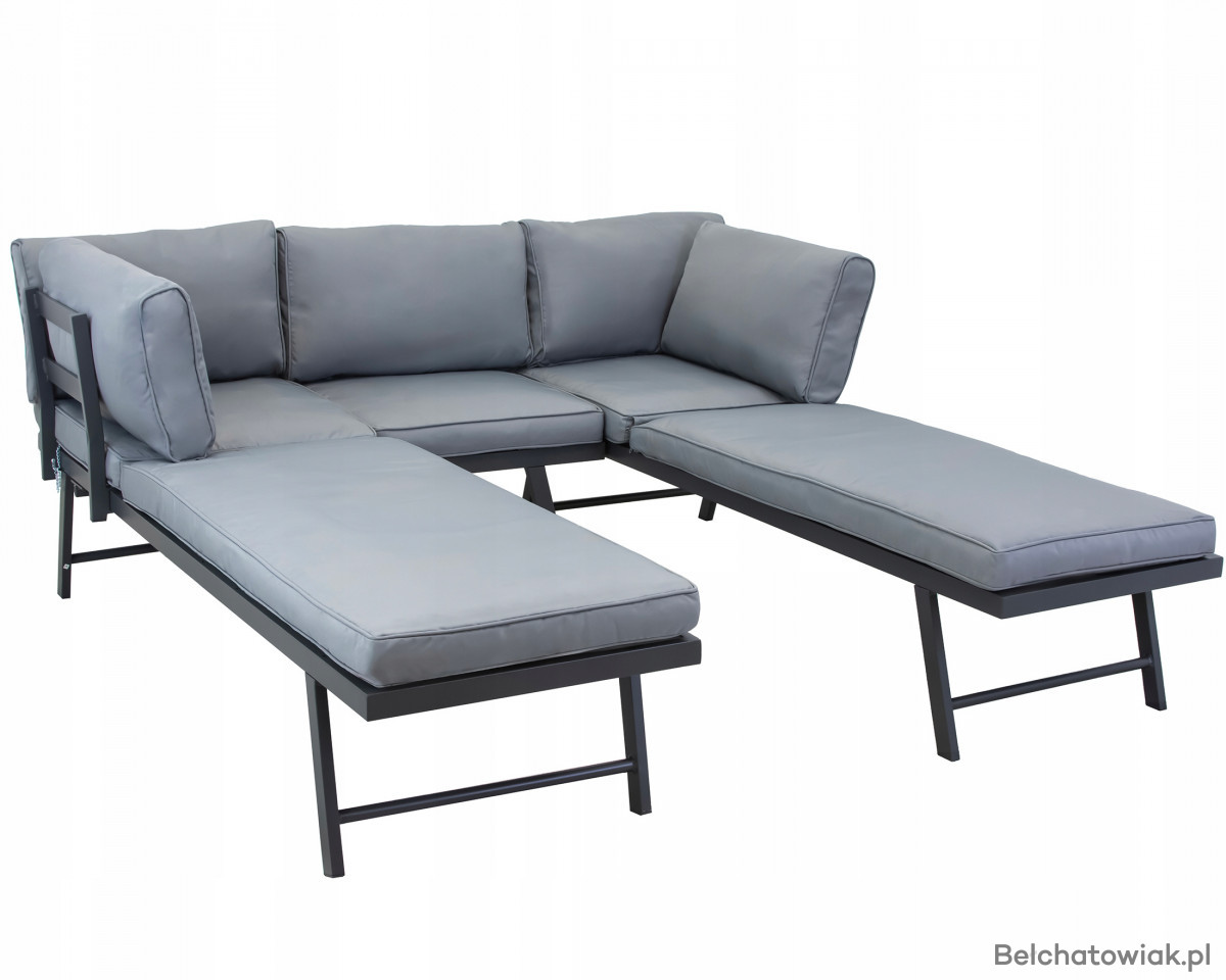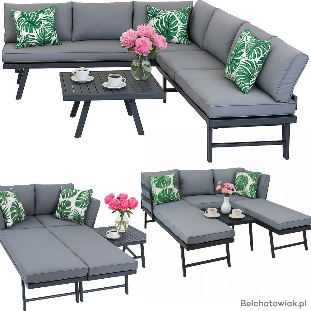 Stylowy i funkcjonalny zestaw mebli ogrodowych, idealny do wypoczynku na tarasie, balkonie lub w ogrodzie. Nowoczesny narożnik z funkcją leżanki i poręczny stolik tworzą wygodną przestrzeń relaksu, idealną na sezon wiosenno-letni.