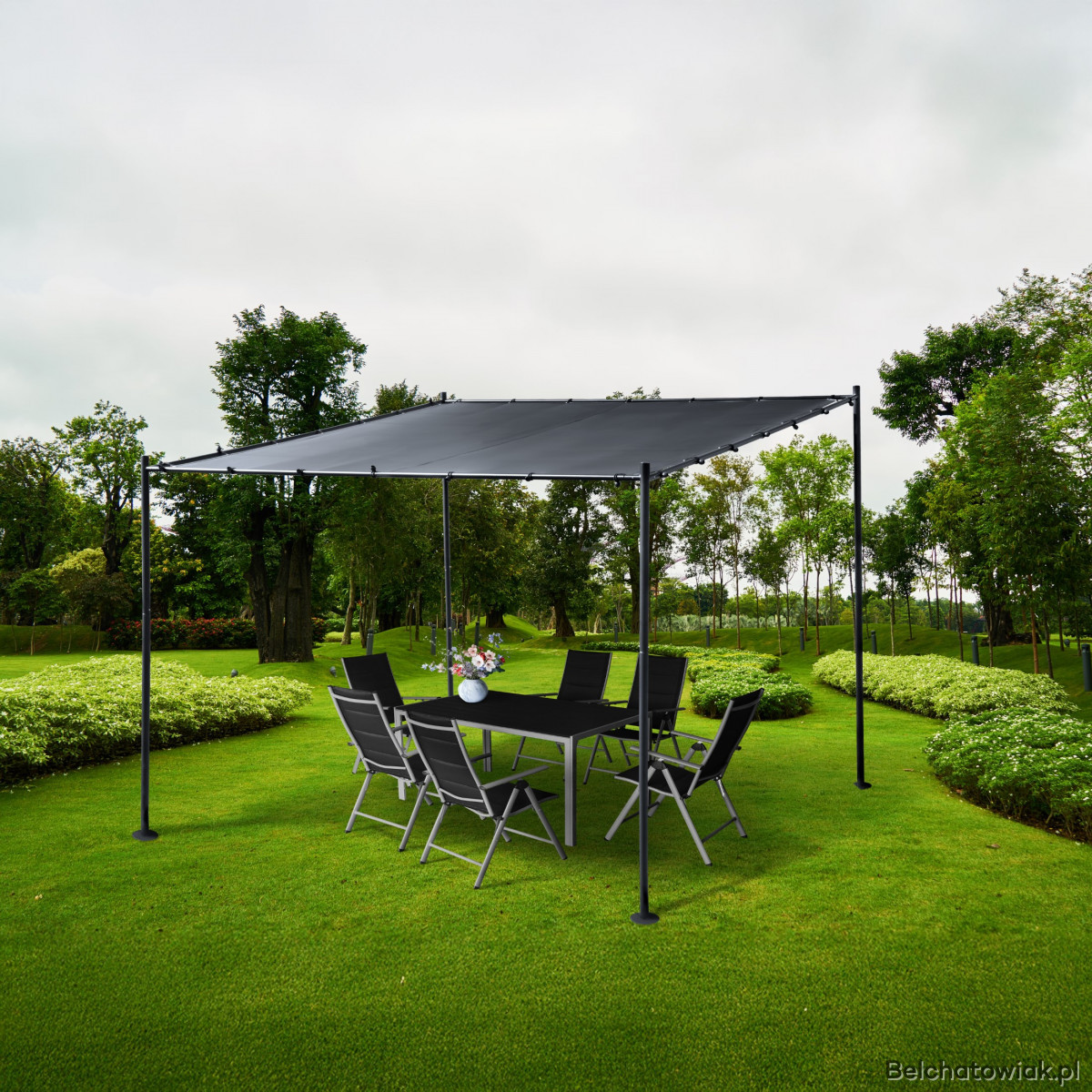 Solidna konstrukcja wykonana ze stali gwarantuje wytrzymałość, odporność na korozję oraz stabilność przez wiele lat użytkowania. Czarna powłoka pergoli nadaje jej nowoczesny i uniwersalny charakter, który wpisuje się w różne style aranżacji zewnętrznych.