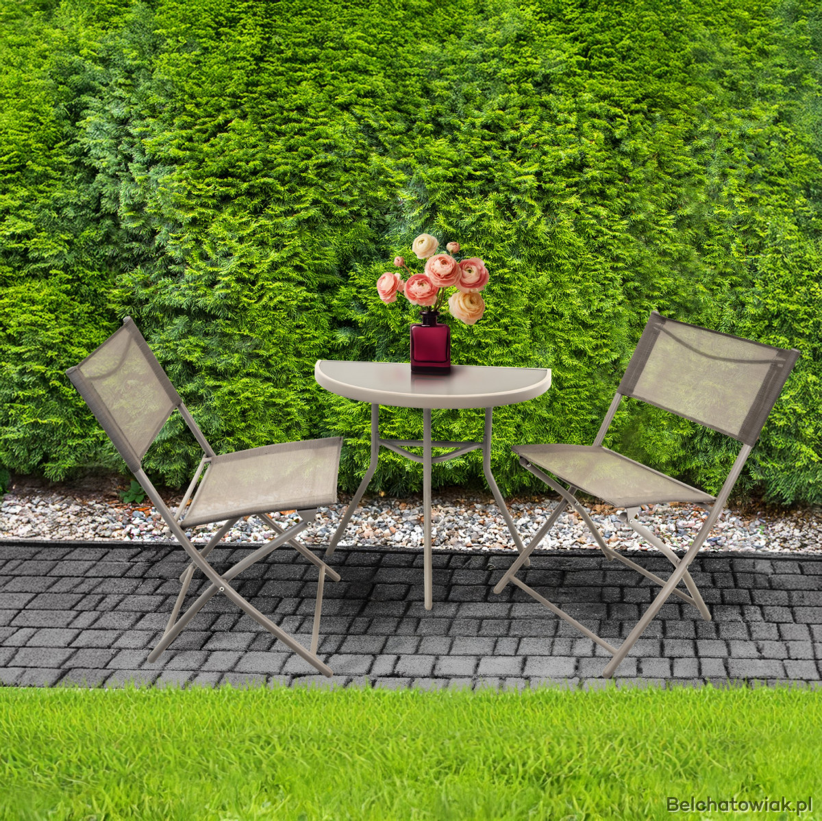 Zestaw doskonale sprawdzi się na niewielkim balkonie, tarasie lub w ogrodzie. Dzięki składanym krzesłom oraz kompaktowym wymiarom, meble łatwo przechowywać poza sezonem.