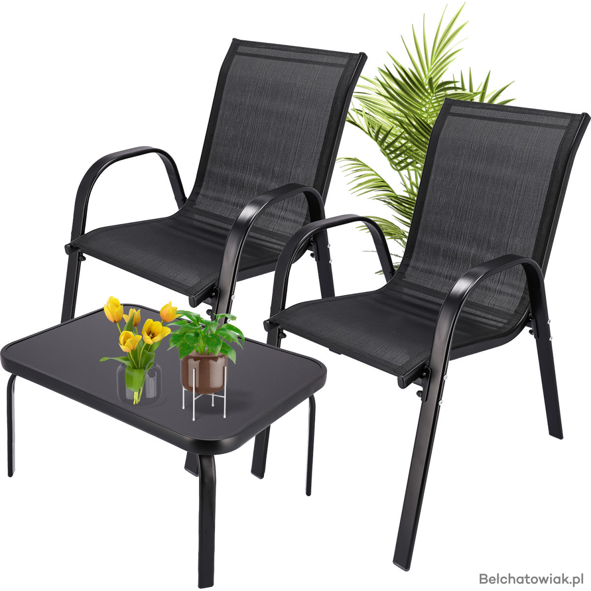 Meble zostały wykonane z odpornej siatki typu textilene, która gwarantuje wygodę użytkowania, dobrą wentylację oraz długą trwałość. Stelaż jest stabilny, a całość przystosowana do użytku zewnętrznego – odporna na działanie promieni UV i zmienną pogodę.