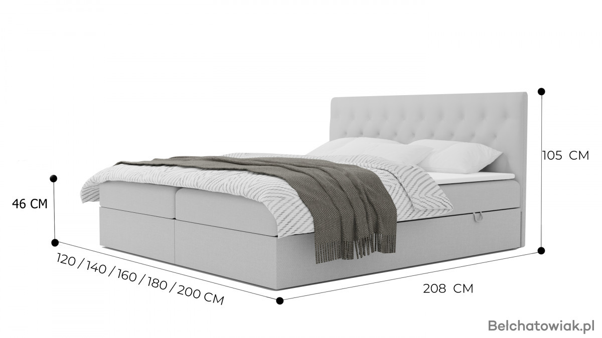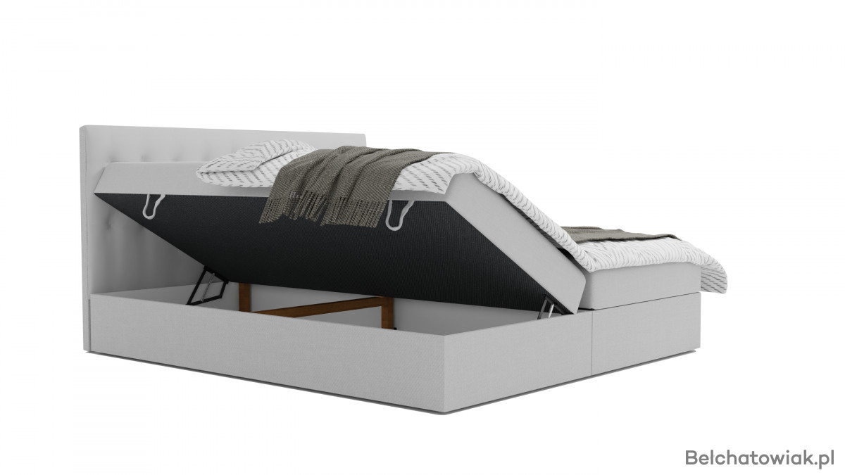 Model BONO wyposażono w dwa pojemniki na pościel, otwierane po bokach łóżka. To praktyczne rozwiązanie umożliwia łatwe przechowywanie dodatkowych koców, poduszek i pościeli, zapewniając porządek i organizację w sypialni.